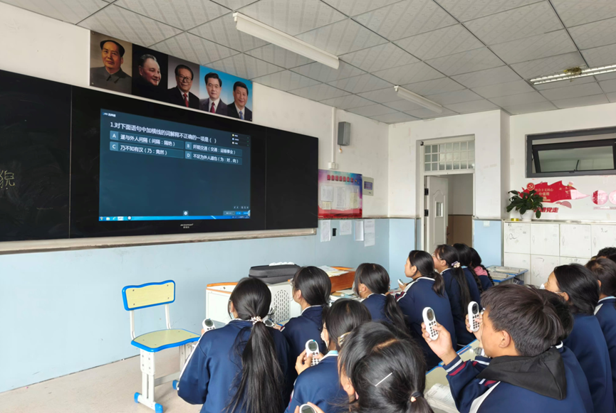 在重慶西大附中星辰學(xué)校的一節(jié)英語(yǔ)課上,學(xué)生人手一個(gè)“遙控器”用來(lái)答題互動(dòng)。據(jù)了解,這個(gè)工具叫做智能語(yǔ)音答題器,可以通過(guò)軟件和教學(xué)大屏直接實(shí)現(xiàn)信號(hào)互通,當(dāng)老師在大屏上下發(fā)單詞或句子朗讀任務(wù)時(shí),學(xué)生只需要通過(guò)智能語(yǔ)音答題器收音,就可以得到實(shí)時(shí)的口語(yǔ)評(píng)分,全班每位學(xué)生的朗讀數(shù)據(jù)也會(huì)在任務(wù)結(jié)束后立刻輸送至教學(xué)大屏,生成個(gè)人和班級(jí)整體的朗讀報(bào)告,教師根據(jù)朗讀報(bào)告精準(zhǔn)點(diǎn)評(píng),針對(duì)性攻克薄弱點(diǎn),可謂事半功倍。